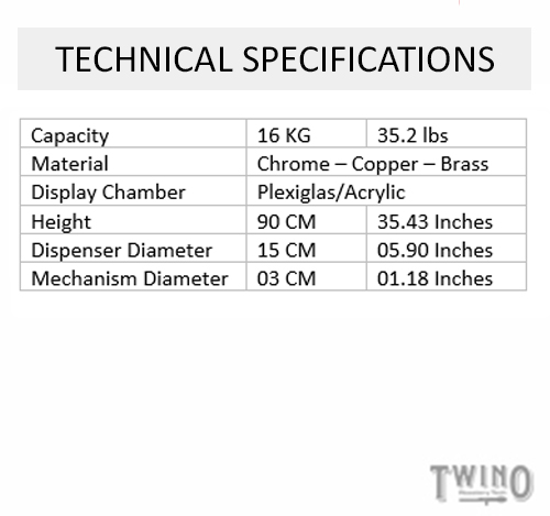 The body is made of stainless chrome. Its front panel can be designed with brass and copper plating on demand. The display chamber is made of Plexiglas.